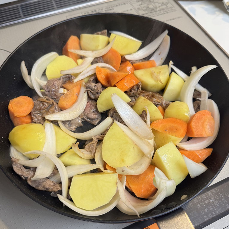 フライパンにサラダ油を中火で熱し、牛バラスライス肉を焼く。半分ほど火が通ったらじゃがいも、にんじん、玉ねぎを加え5分ほど炒める。