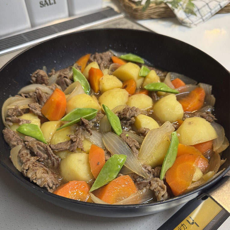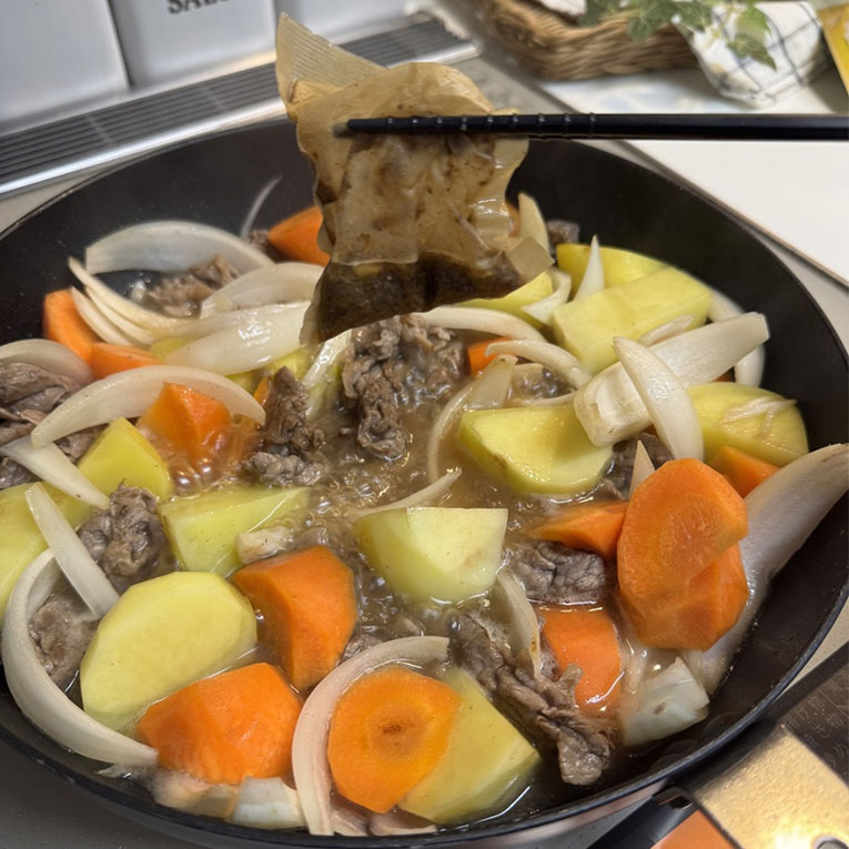 煮る前に具材を油でさっと炒めておくのがポイント。コクと香ばしさが加わり、煮崩れもしにくくなります。ひと手間で仕上がりがぐっと変わります。